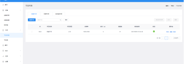 點擊【節目】,進入到節目列表,可對節目重命名、預覽、編輯、復制、發布、歷史記錄、節目創建者、修改時間等操作,如果節目比較多,可以在節目名稱后面的文本框輸入關鍵字,點擊“查詢”按鈕即可,圖3-1。圖3-1節目列表?ID:節目的ID;?節目類型:創建節目時選擇的設備類型;?節目名稱:創建節目的名稱;?分辨率:創建節目的模擬顯示屏的大?。?時長:節目總時長;?創建者:創建節目的用戶名稱;?修改時間:最后編輯節目的時間;?狀態:如果節目內容沒有暴力恐怖、色情違法或敏感詞匯,則為綠色圖標,AI一般可以審核通過;否則為紅色,需要人工再審核才能通過;?操作項:可對節目預覽、編輯、重命名、GPS定點播放、播控...
